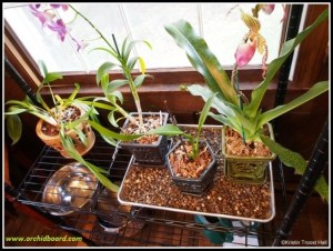 Per coloro che non hanno la possibilità di stare a casa e vaporizzare l’aria intorno alle orchidee alcune volte al giorno, esistono altre soluzioni. Uno dei più efficaci è il così detto sottovaso dell’umidità (humidity tray in inglese), che consiste in un sottovaso profondo (4 – 8 cm) con una griglia sul quale si appoggiano i vasi. Nel sottovaso poi si mette l’acqua che, grazie alla griglia, non tocca i fondi dei vasi e quindi non inumidisce le radici. Una struttura così la potete vedere nella foto.