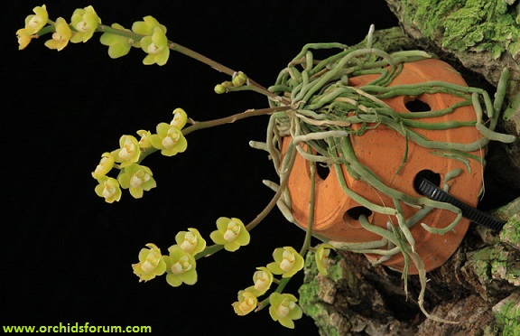 Le radici della Chiloschista usneoides devono essere esposte alla luce, quindi l’unico modo valido di coltivarla è a radice nuda. Le Chiloschiste amano superfici lisce, perciò la scelta migliore sono le zattere di tronchi lisci (no sughero). Un altro modo ingegnoso che ho visto e di sistemare la pianta su un vaso di cotto capovolto, come si vede nella foto.