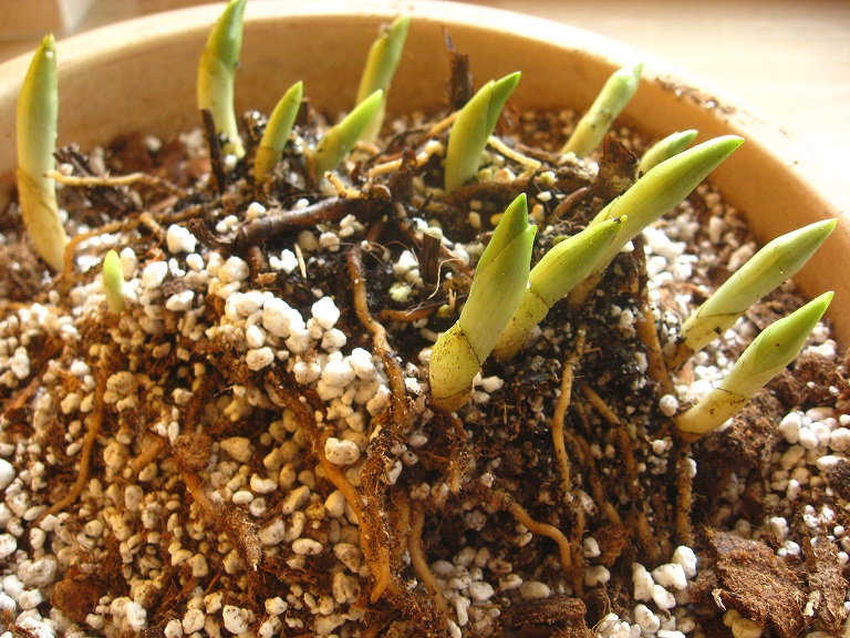 Questo collegamento non si taglia, perché il getto giovane non riuscirà a sopravvivere da solo, senza le radici dello stelo che l’ha prodotto. Comunque io suggerisco di lasciare almeno 4 getti giovani (con i loro genitori) collegati tra di loro per divisione. Un gruppo così supererà l’intervento con il minimo stress, mentre per un solo internodo ci sono meno possibilità di sopravvivere.