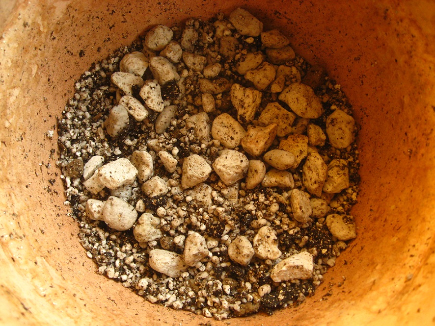Avendo diviso la pianta, iniziamo a metterla nel vaso. I primi 4-5 cm del fondo del vaso si riempiono con il lapillo o altra pietra lavica e perlite.