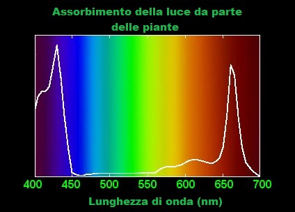 Come vediamo, le orchidee non utilizzano le onde da 450 a 550 nm, e utilizzano pochissimo le onde da 550 a 650 nm. Invece nei punti di 430 e 660 nm l’assorbimento di energia è massimo, e massima sarà anche la fotosintesi.