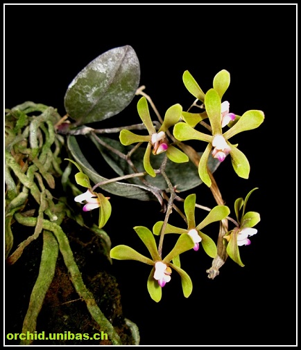 E’ una specie monopodiale, con foglie che vanno dai 5 ai 16cm di lunghezza. Può produrre dai 3 ai 14 fiori per volta, con un profumo che ricorda la vaniglia.