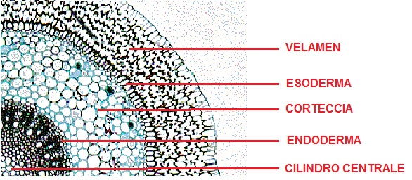 1. Velamen. È uno strato superficiale permeabile, che permette alla pianta di assorbire l’acqua sia dall’atmosfera, sia dal contatto diretto con le gocce. È composto da cellule morte e vuote, e la sua funzione assomiglia a quella di una spugna: al contatto con l’umidità le membrane delle sue cellule si gonfiano e assorbono l’acqua, che poi fanno passare tramite i capillari verso gli strati interni della radice. Lo spessore del velamen dipende dalla specie: in alcune può arrivare a 17-19 cellule, in altre è molto sottile, 3-6 cellule.